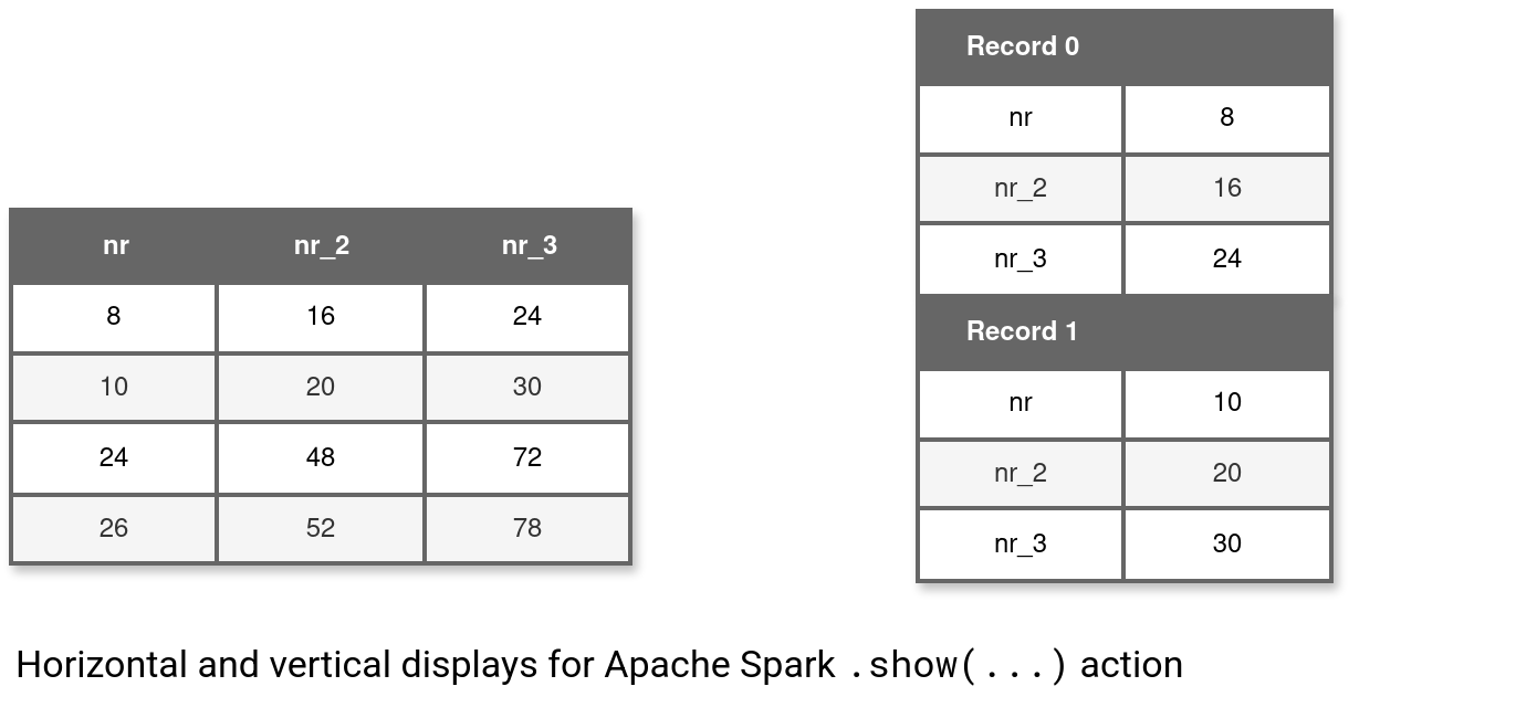 Finally, depending on the third parameters which is vertical boolean flag, you can decide to display the DataFrame as a regular table, or as a vertical table composed of column name and value in rows. You can see how both behave in the last image: