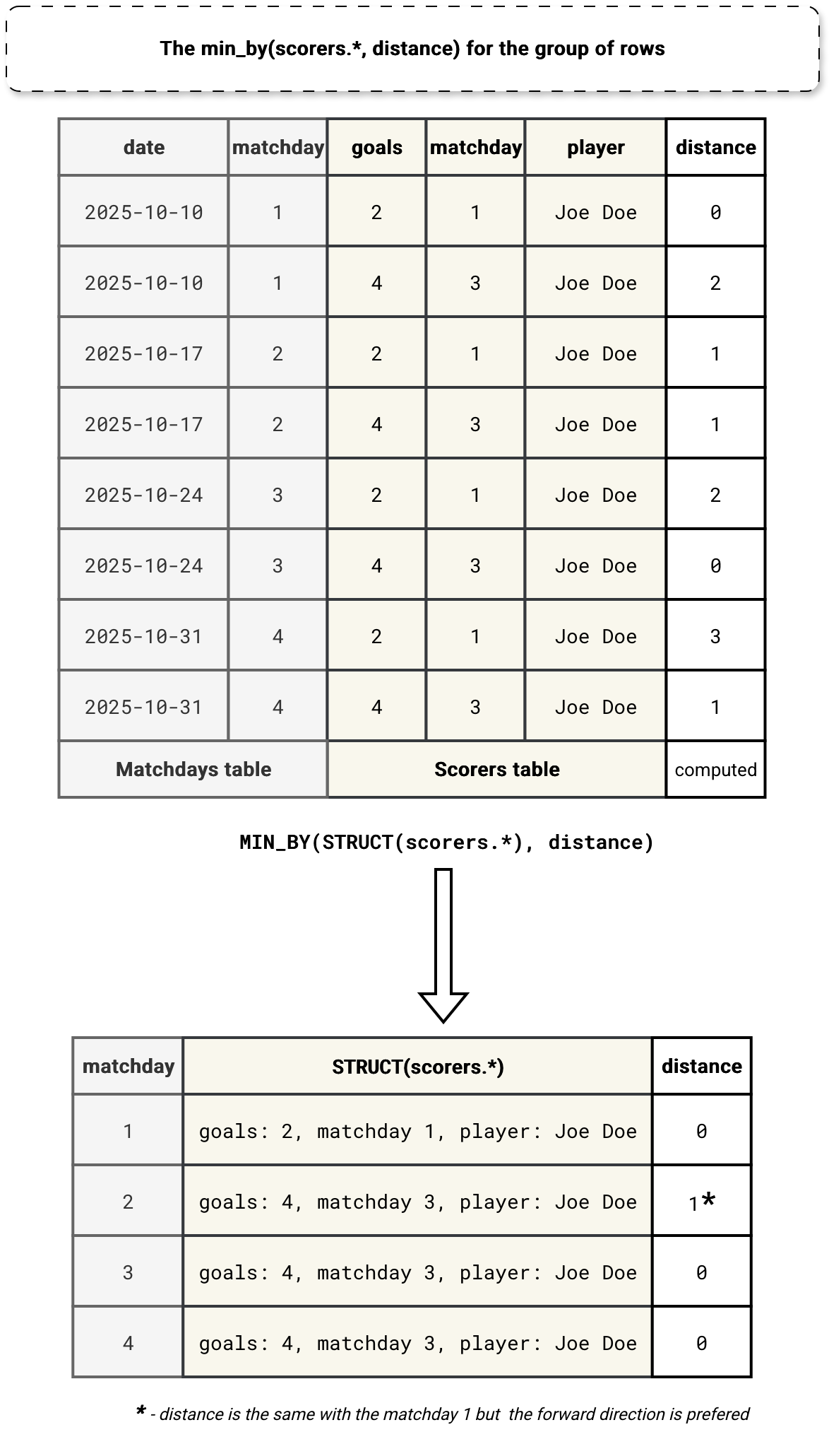 Inside the rewritten query you can notice a MIN_BY aggregation. The purpose of it is to get the value (STRUCT(scorers)) corresponding to the smallest distance expressed by the ordering column on the matchday. Overall, this process of combining rows and getting the smallest distances can be summarized as: