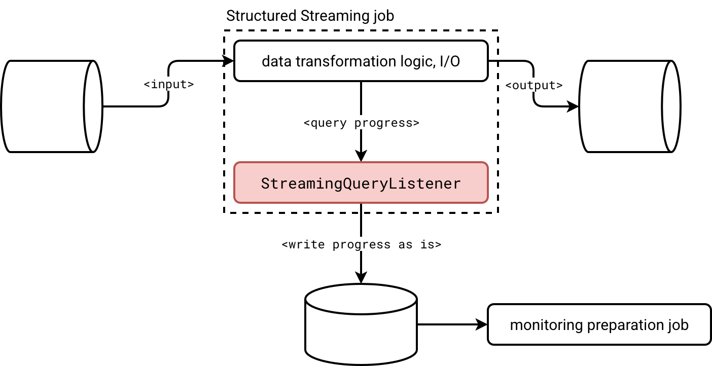 - Implementation ease. Implementing a listener is easier than writing a custom parser for checkpoint files that embed many JSON lines and some of them are not relevant to the progress tracking. With the listener, Apache Spark gives you exactly what you want, without any additional noise such as checkpoint version flag.