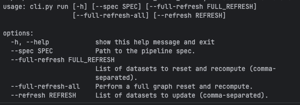 The next step after the pipeline definition is the spark-pipelines execution. To see what what are the run command parameters: