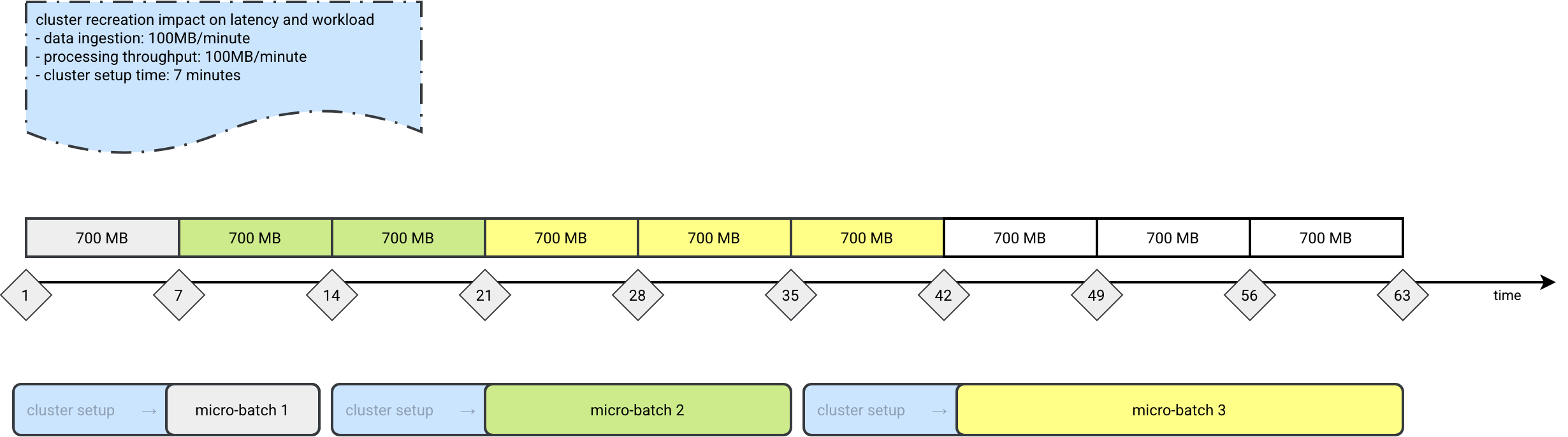 To see this in action, let's assume an example where our ingestion rate and processing time are both 100MB/minute. However, due to the cluster creation, the latency will continuously increase. While the next cluster is starting, the new data will be added, leading to increased execution time. I put some colors on the picture to highlight what parts of the ingested packages - represented here as 700MB for the 7 consecutive minutes - are consumed by a given micro-batch: