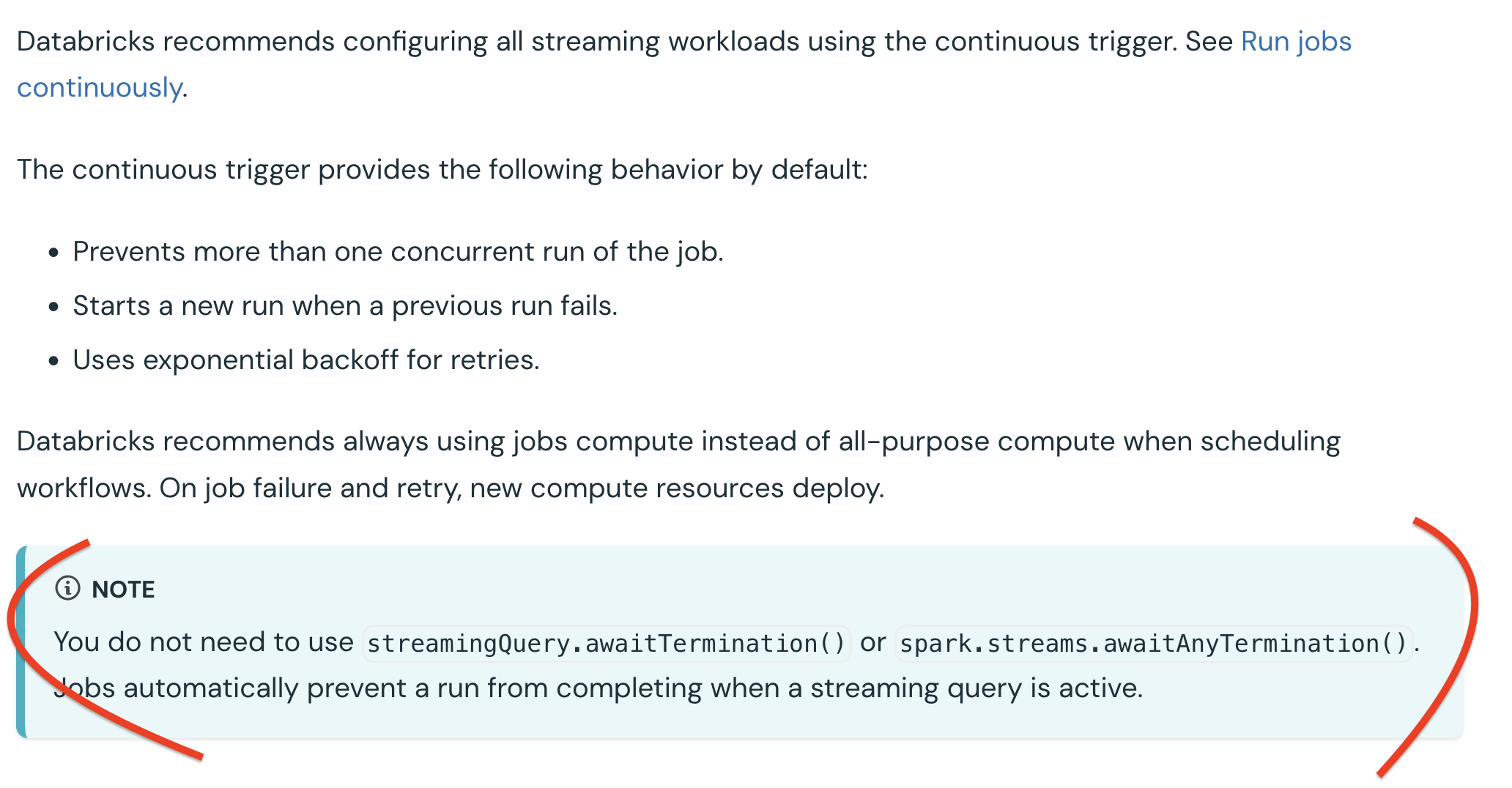 If you have just landed a new project and are working for the first time with the continuous trigger, do not be surprised to not see the awaitTermination. Lakeflow Job service takes care of keeping your streaming queries up and running.