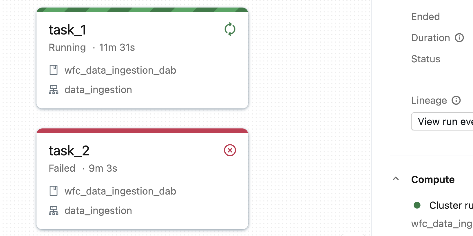 The job will be running unless you configure the task_retry_mode to ON_FAILURE. In that setup Lakeflow will automatically retry the failed task. Here is what happens with our job after enabling this on failure mode: