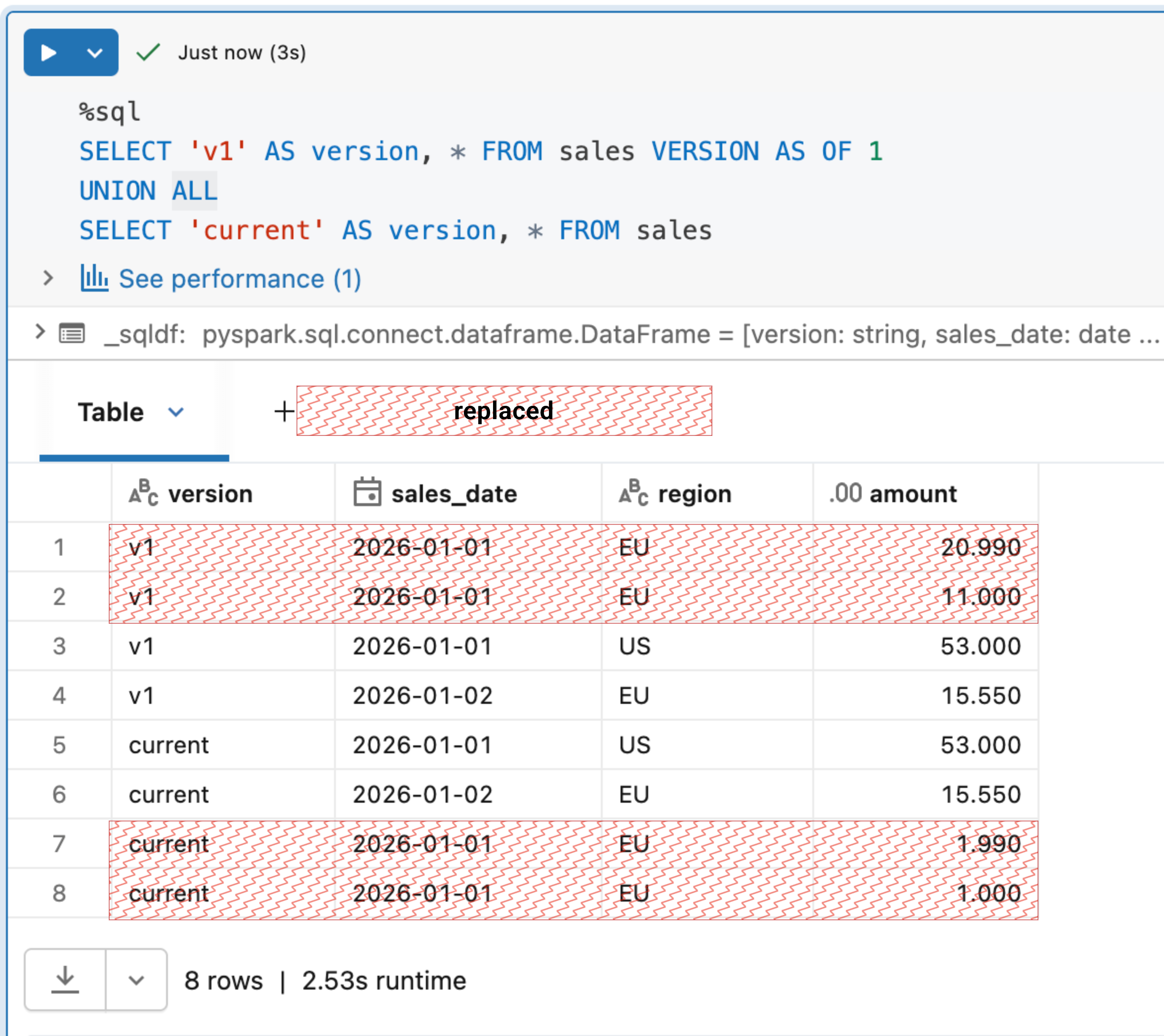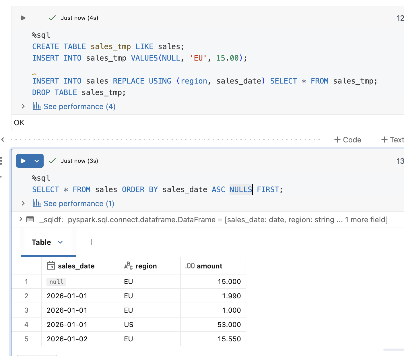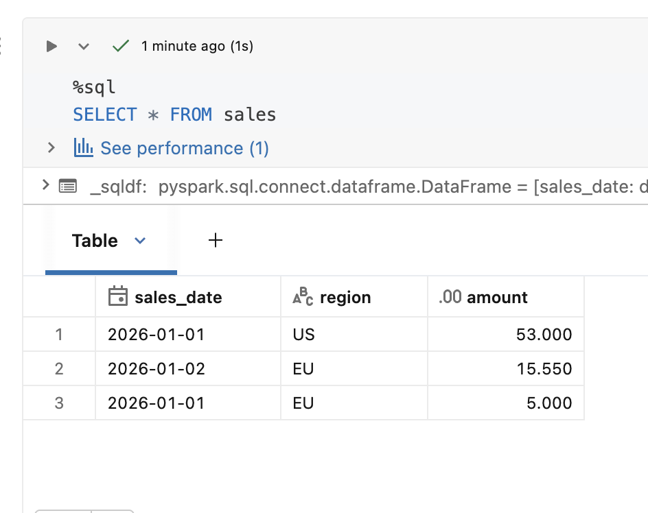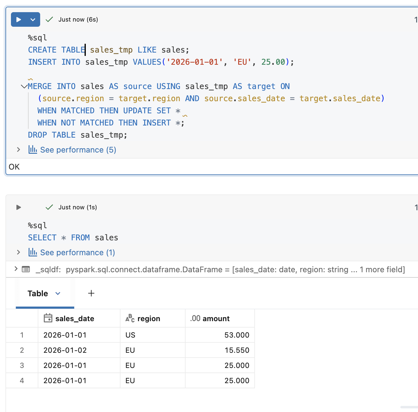 INSERT INTO sales_tmp VALUES ('2026-01-01', 'EU', 1.99), ('2026-01-01', 'EU', 1.00);