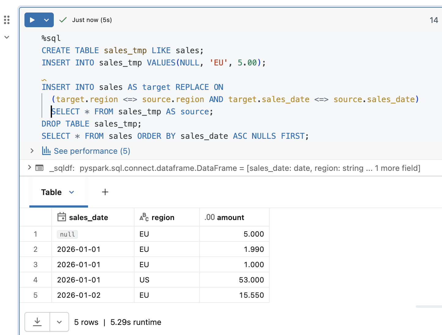 Although this INSERT...REPLACE is a great addition to the data ingestion capabilities on Databricks, there is a tiny drawback. At the moment it's only supported with SQL, and if you are a seasoned DataFrame API user, you will have to create a temporary table with your input data before running the insert. But it should be an acceptable trade-off because the feature extends your ability to operate on the liquid clustered tables, and also helps cover fully incremental scenarios that might be impossible to solve with MERGE.