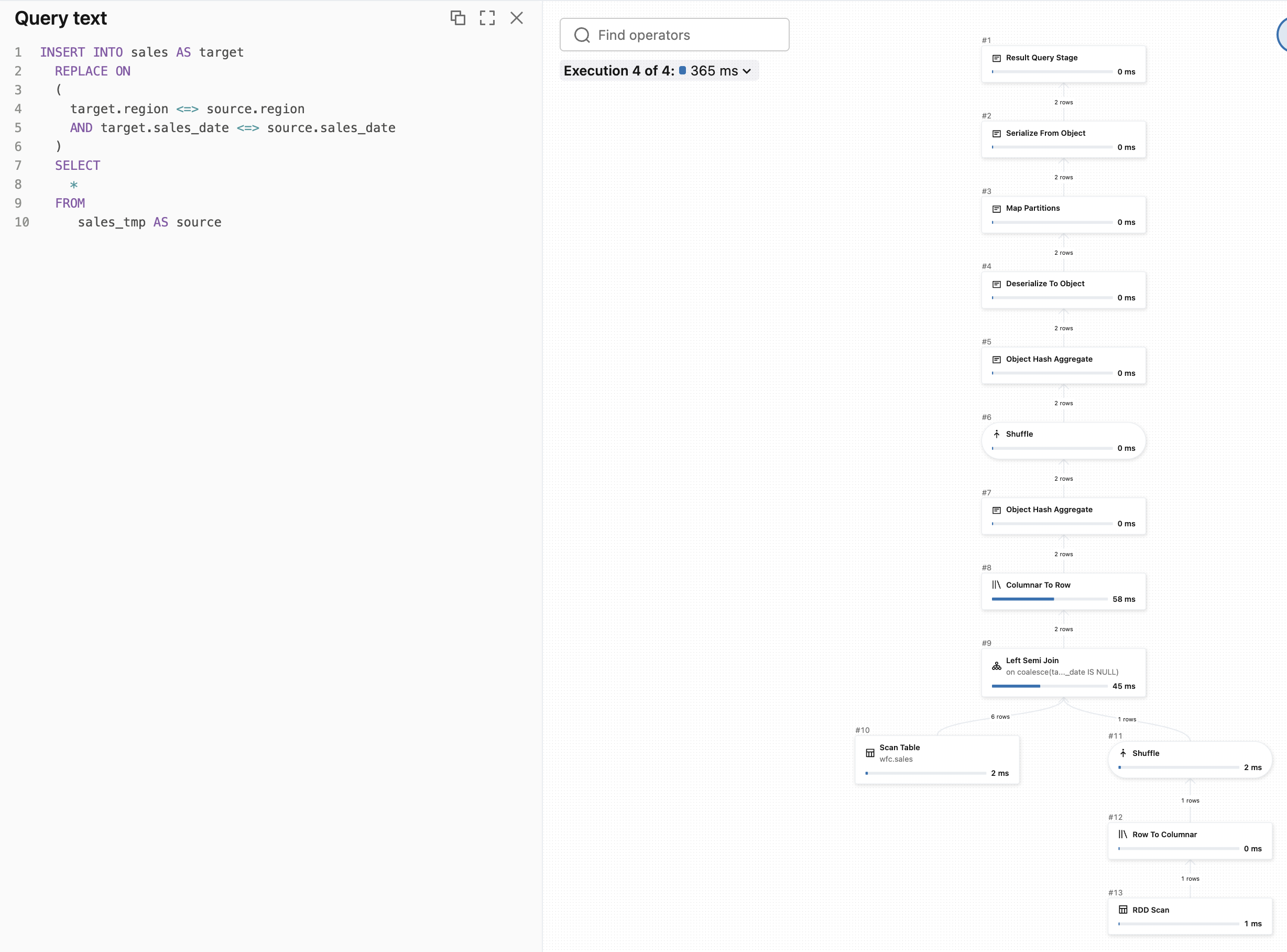 But when you start involving explicit join condition, the query plan will change and involve shuffle. Even for the INSERT...REPLACE ON! Let's see the execution plan for the previous replacement query that protected us against null issues: