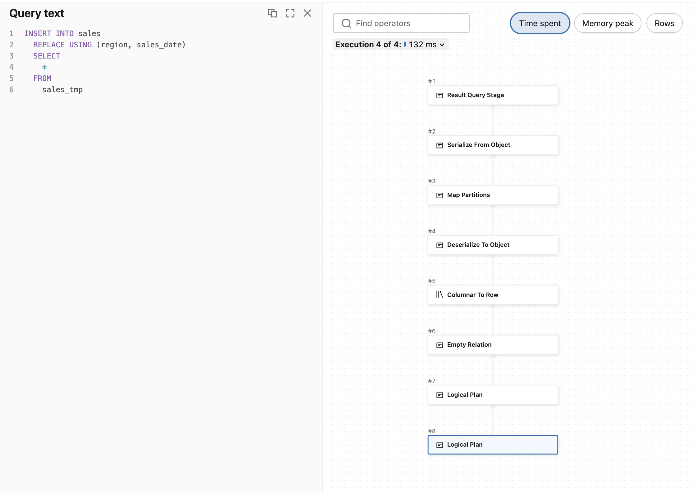 Here is the query profile for the INSERT...REPLACE USING. As you can see, the plan is linear, i.e. it goes straight from up to bottom:
