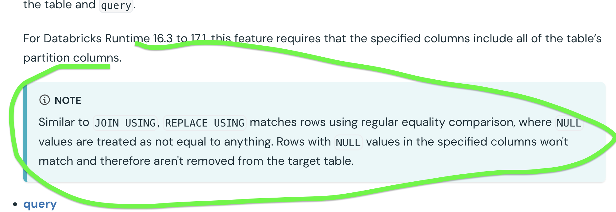 The question now is, why this new INSERT...REPLACE, knowing that we can already dynamically replace a partition on Databricks? Unfortunately, the dynamical partition replacement is limited to...the partitioned tables so you won't be able to use it for tables created with liquid clustering. On the other hand, the replaceWhere option is an alternative, but it requires an explicit definition of the data to be replaced - which, as you can see, defeats the purpose of a truly dynamic process.