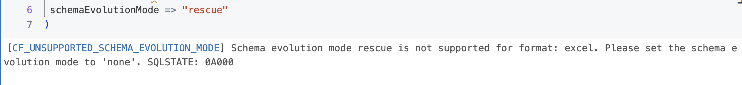 Put differently, when you are processing a file and the reader encounters different schemas, like it might happen for JSONs for example, you can configure the file_reader function to add new encountered columns dynamically. However, this attribute is not supported by Excel which expects a static schema. If you try to set anything else than none, you will encounter this error: