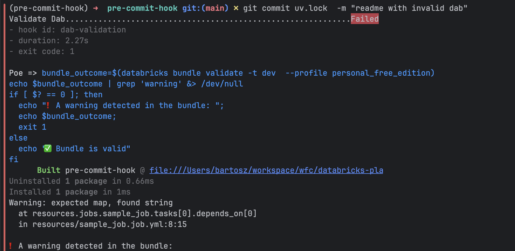 You see my point, this error will hurt you only when you deploy the bundle. If you can do this only from your CI/CD pipeline, this syntax error means possibly one additional fix commit before you can actually test the deployed version. Of course, you can also run this validation manually and fix the error but you need to remember that. On another hand, if you include the validate command as part of the pre-commit hook, Git will do it for you (as long as you remember installing the hook 🙃).