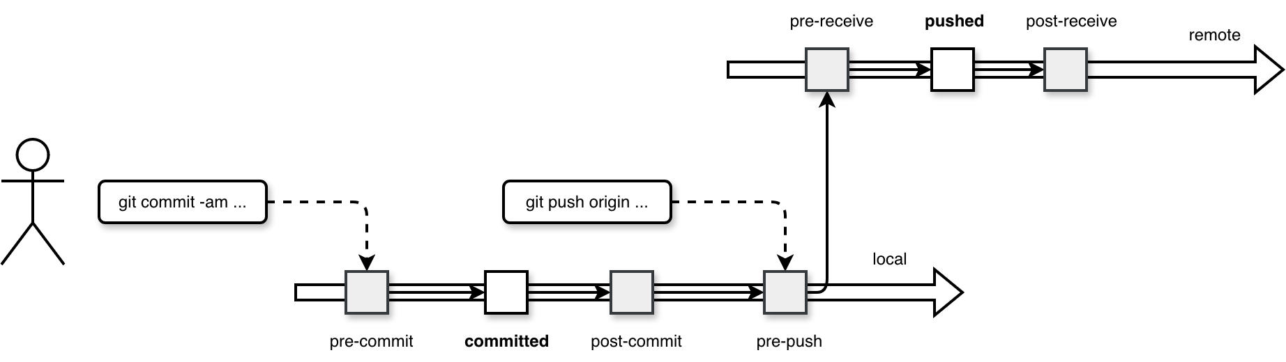 As you can see in the diagram, whenever you execute a Git operation, the underlying setup invokes some additional code that may prevent your changes from being committed or pushed (the pre- hooks).