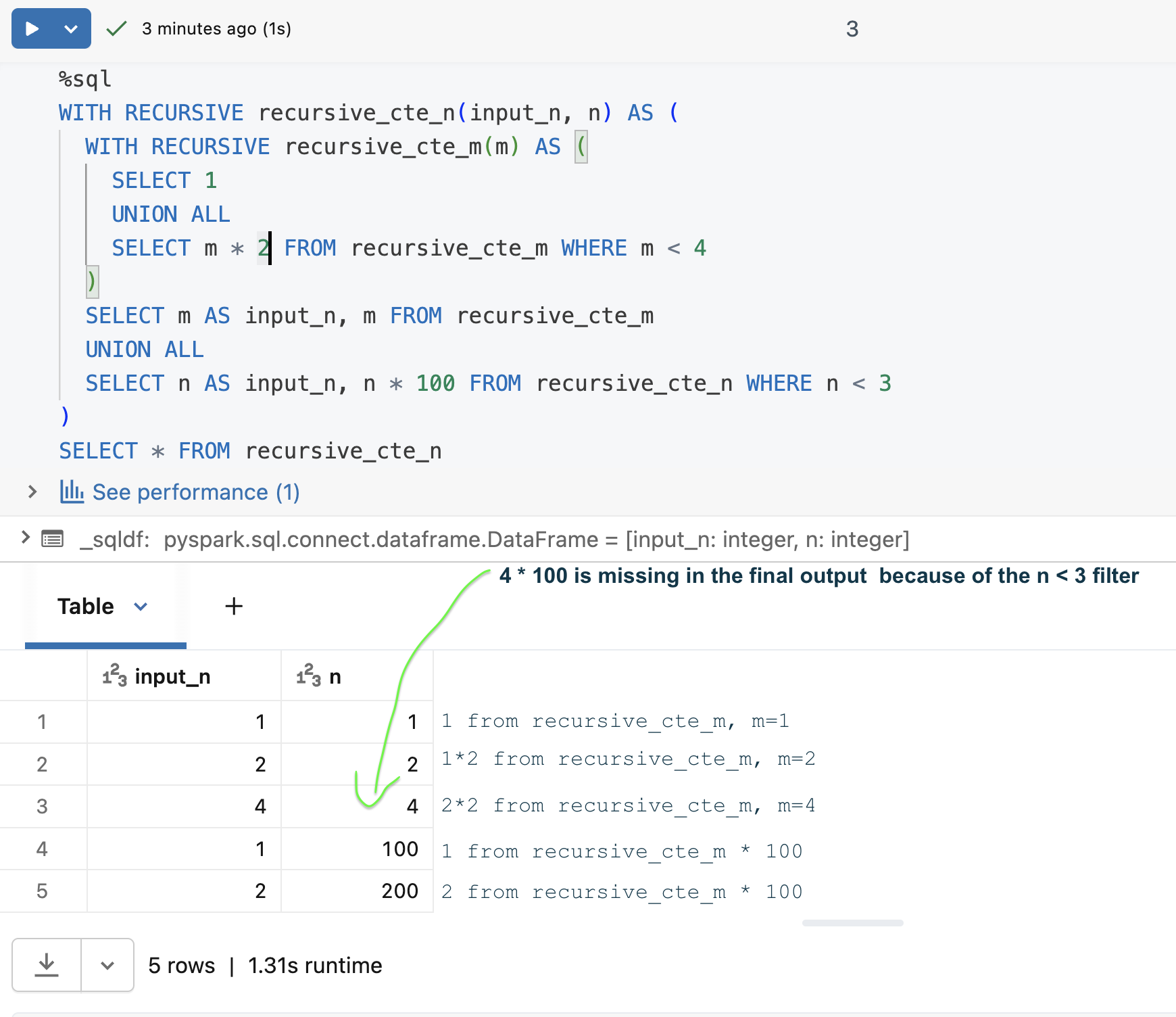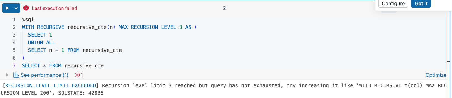 To control the recursion depth, you have two choices. The first is the stop condition in the query. For example, if you are joining already accumulated results with the new recursive candidate rows, you can stop when there are no more matches possible. The stop condition is good if it won't make your query too expensive, though. Imagine a huge table that will be running recursively. You would need a strong cluster to get the recursion right and with the pay-as-you-go mode, the longer your query runs, the more you pay. In that case, you can decide to stop after an arbitrary number of iterations, thereby defining the max recursion level. Databricks recursive CTEs support both solutions.