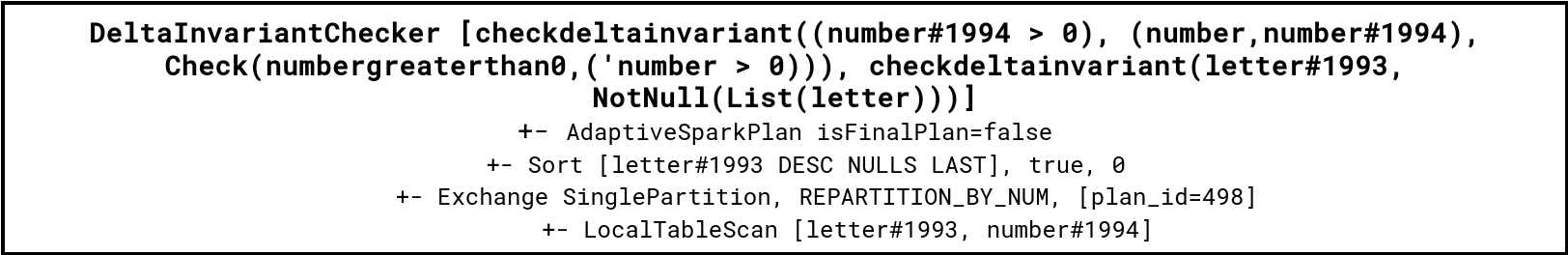 How do the constraints integrate to the execution flow? The answer is quite simple, wrapping. Whenever you try to write a DataFrame to a table with defined constraints, Delta writer will wrap the initial execution plan with a DeltaInvariantChecker node. You can see an example of the plan wrapped by the invariants checker just below:
