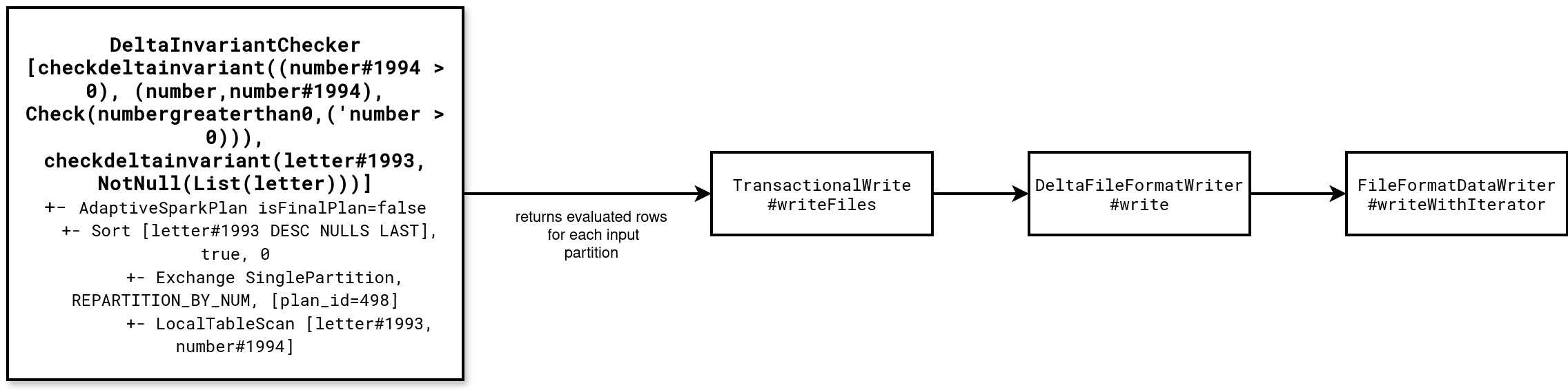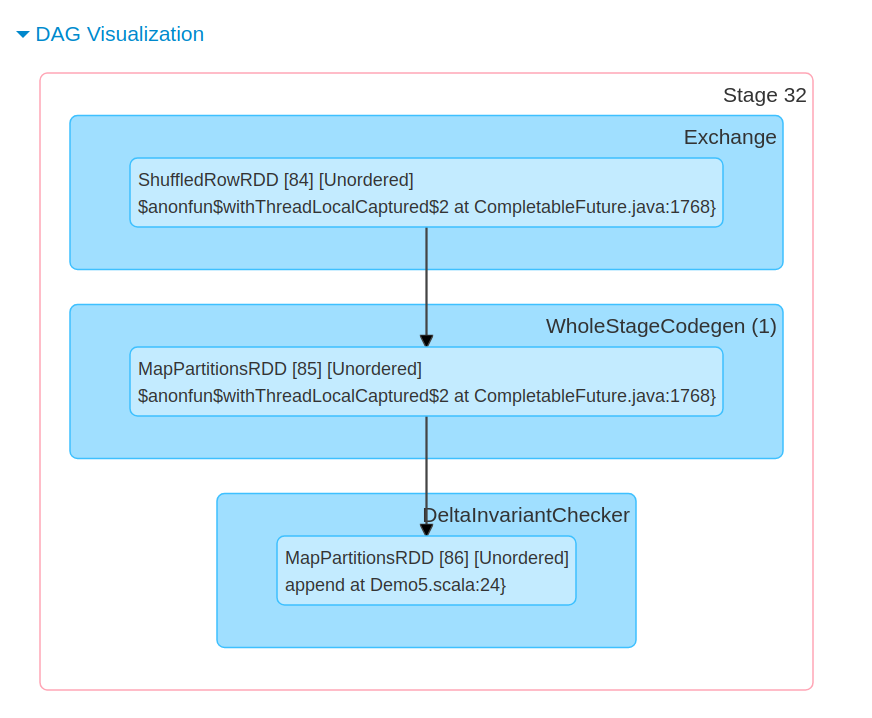 You can also check the source code to analyze the constraints evaluation at writing. The next schema summarizes the execution stack where the DeltaInvariantCheckerExec wraps each row passed to the task-based writer without creating a separated stage: