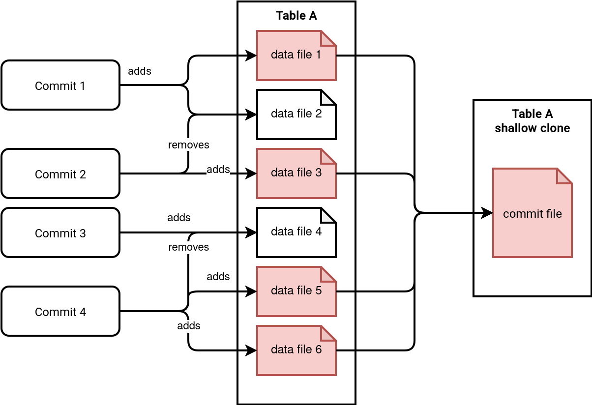 class CloneDeltaSource( sourceTable: DeltaTableV2) extends CloneSource { // ... private val deltaLog = sourceTable.deltaLog private val sourceSnapshot = sourceTable.initialSnapshot def allFiles: Dataset[AddFile] = sourceSnapshot.allFiles // ... abstract class CloneTableBase(sourceTable: CloneSource, tablePropertyOverrides: Map[String, String],targetPath: Path) extends LeafCommand with CloneTableBaseUtils with SQLConfHelper { // ... protected def handleClone(spark: SparkSession, txn: OptimisticTransaction, destinationTable: DeltaLog, hdpConf: Configuration, deltaOperation: DeltaOperations.Operation, commandMetrics: Option[Map[String, SQLMetric]]): Seq[Row] = { val addedFileList = { val toAdd = sourceTable.allFiles // absolutize file paths handleNewDataFiles(deltaOperation.name, toAdd, qualifiedSource, destinationTable).collectAsList() } val addFileIter = addedFileList.iterator.asScala var actions: Iterator[Action] = addFileIter.map { fileToCopy => val copiedFile = fileToCopy.copy(dataChange = dataChangeInFileAction) // CLONE does not preserve Row IDs and Commit Versions copiedFile.copy(baseRowId = None, defaultRowCommitVersion = None) } recordDeltaOperation( destinationTable, s"delta.${deltaOperation.name.toLowerCase()}.commit") { txn.commitLarge( spark, actions, Some(newProtocol), deltaOperation, context, commitOpMetrics.mapValues(_.toString()).toMap) }