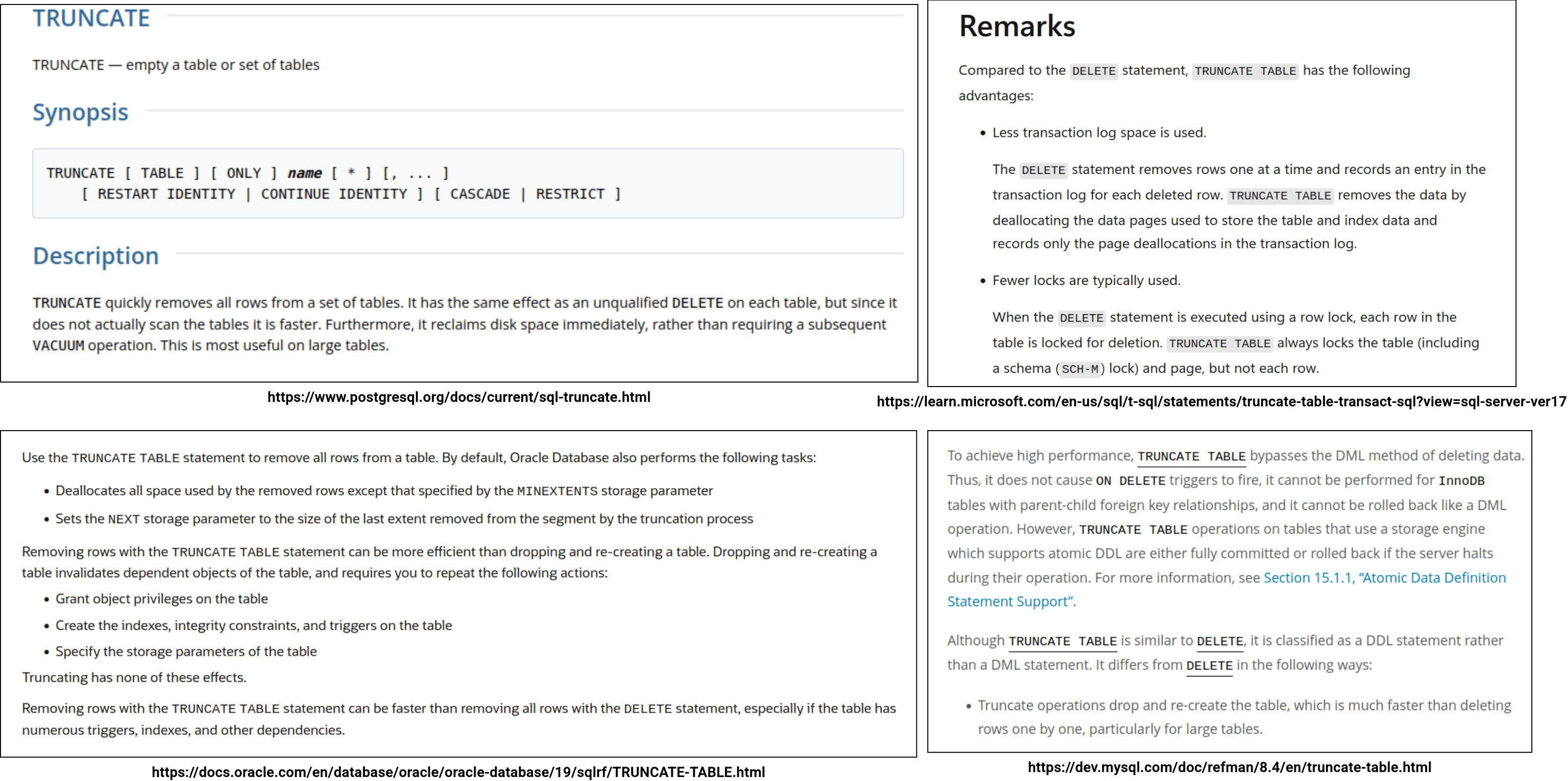 If we had to translate the TRUNCATE TABLE to some real-world action, it might be erasing a whole drawing. Just imagine your kid asked you to draw a car but after you drew the wheels, he changed his mind and now he wants you to draw a house. I doubt you could adapt four wheels to a house, so the single way is to erase everything without thinking. On another hand, if he asked you to finally draw a tractor. In that case you can simply erase two wheels behind and replace them with bigger ones.