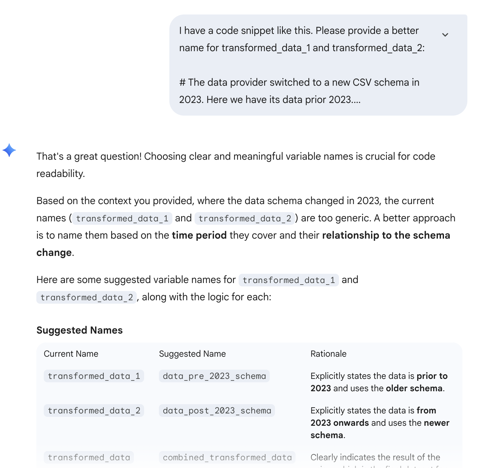 I hope after this quick example you better understand how well-chosen names can help you write more easily understandable code. But the challenge is how to choose these names. The easiest way nowadays is to ask your coding assistant by clearly describing what a function or variable does or is. The assistant will likely propose a few great names.